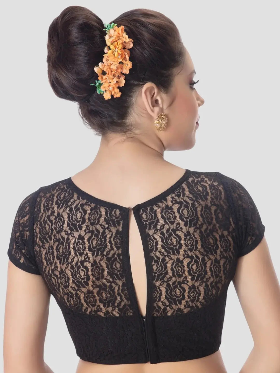 The black cap sleeves floral net blouse is a sophisticated and stylish garment that seamlessly combines classic design elements with modern flair. Crafted from a delicate black net fabric, the blouse exudes an air of elegance and femininity. The cap sleeves add a touch of modesty and charm, creating a balanced and refined look. The highlight of this blouse is its exquisite floral pattern that gracefully adorns the entire fabric.