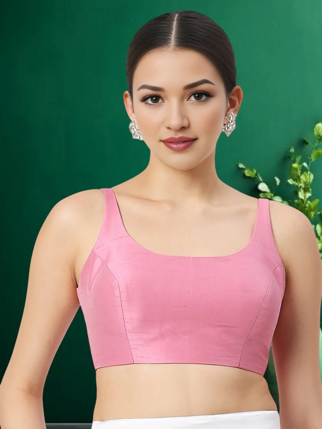Elevate your saree ensemble with this exquisite pink solid silk blouse. Crafted from luxurious silk, this readymade blouse features a chic spaghetti strap design that gracefully frames the shoulders. The round neck adds a touch of elegance, while the sleeveless cut ensures comfort and a modern look. Perfect for any occasion, this versatile blouse can be paired with a variety of sarees to create a stunning, stylish appearance.