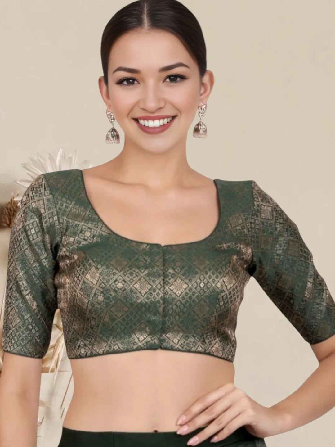 Product Description Elevate your ethnic wardrobe with this exquisitely crafted Banarasi brocade readymade blouse, designed to add effortless elegance to any saree look. Featuring a luxurious woven pattern inspired by traditional Banarasi artistry, this blouse showcases intricate golden motifs arranged in a rich geometric design that shines beautifully under light. The premium fabric not only offers a sophisticated sheen but also ensures lasting comfort for long hours of wear. The blouse comes with a stylish front-hook closure, giving it a clean, structured finish at the front. Its flattering wide round neckline enhances femininity, making it suitable for festive occasions, weddings, cultural celebrations, and evening gatherings. The half sleeves offer a modest yet stylish appeal, maintaining the perfect balance between tradition and modern charm. At the back, the blouse features an elegant deep round cut enhanced with decorative dori ties and tassels, adding a graceful touch while providing adjustable support for a perfect fit. The fabric sits smoothly on the body, highlighting your silhouette without compromising comfort. Available in stunning, versatile shades like navy blue, bottle green, and black?old, this blouse pairs effortlessly with silk sarees, chiffon sarees, georgette sarees, and designer drapes. Whether you want to create a regal festive look or a sophisticated party ensemble, this Banarasi brocade blouse is the ideal choice to make every appearance memorable.