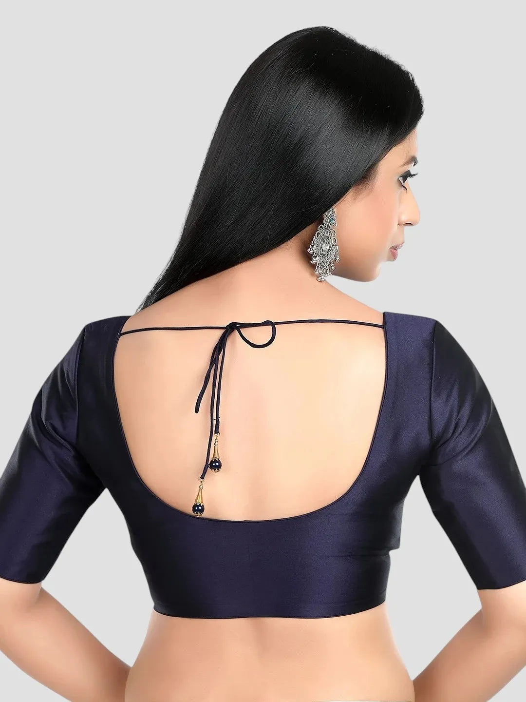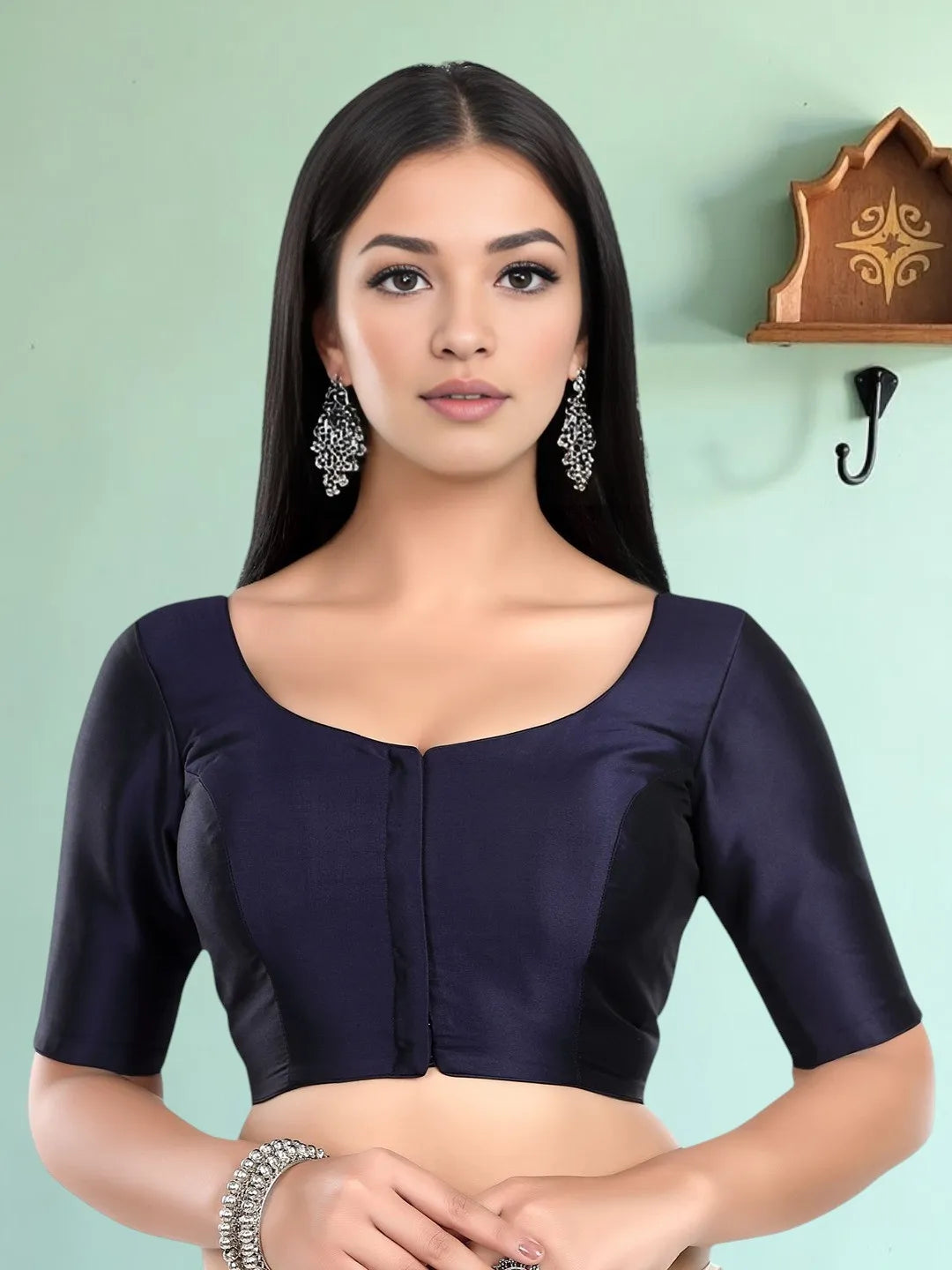 A Navy Blue Silk Plain Blouse with a Round Neckline and half sleeves is a versatile and classic garment that epitomizes understated elegance and sophistication. This blouse is designed to be a wardrobe staple, suitable for a wide range of occasions and versatile enough to complement various outfits.