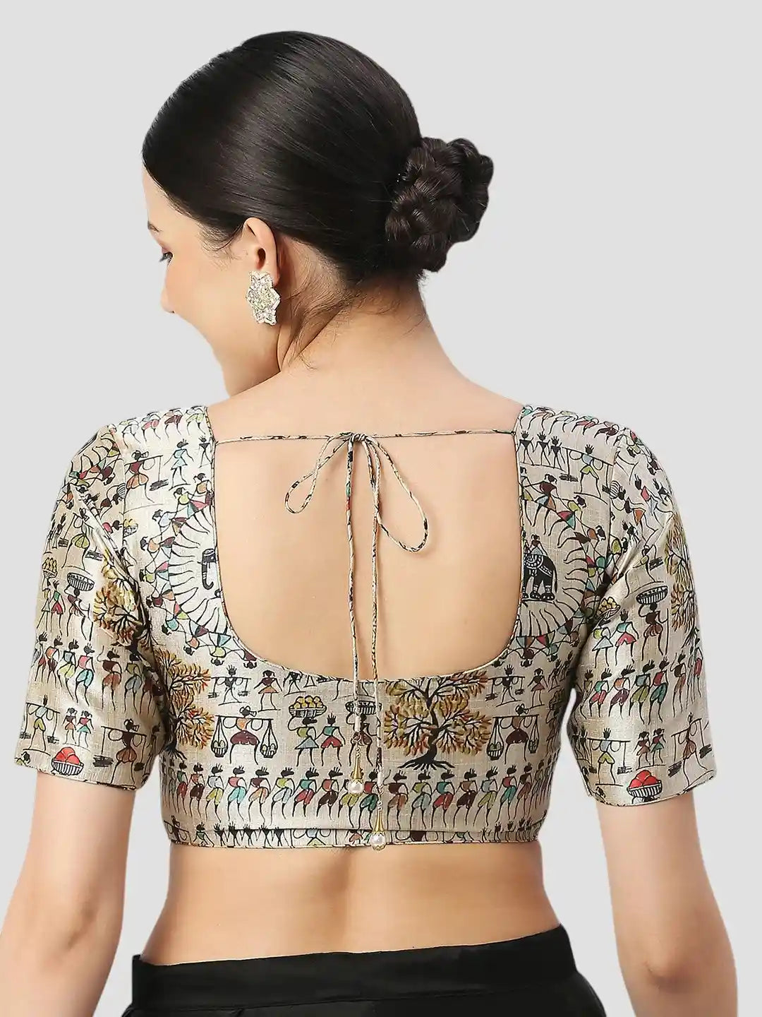 Embrace the timeless allure of this Bhagalpuri silk saree blouse in creamy hues adorned with intricate Warli prints. Featuring a classic round neckline and graceful half sleeves, this blouse exudes sophistication and charm. Elevate your ethnic ensemble with this exquisite piece, perfect for adding a touch of tradition to any occasion.